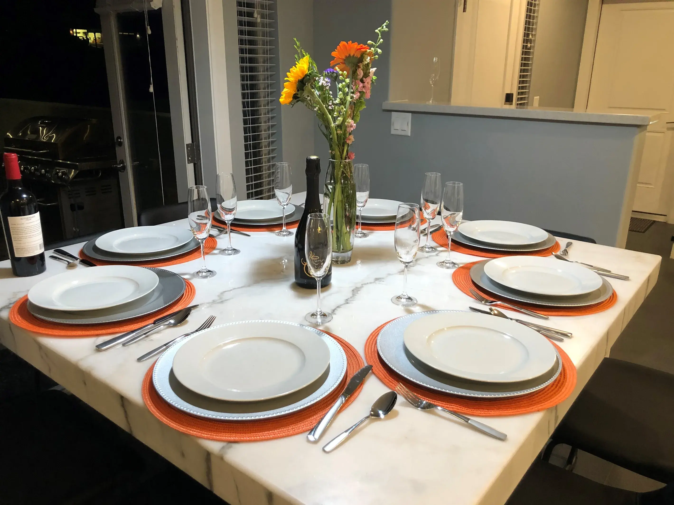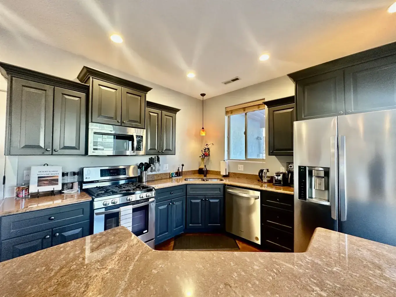 KITCHEN: This spacious kitchen comes fully equipped with appliances including coffee maker, blender, toaster, gas stove, refrigerator with ice maker, microwave and dishwasher. Large dining table seats eight. Double doors lead out to a large back patio equipped with BBQ gas grill, ambient lighting and outdoor seating, gas fire pit and 7-person private hot tub.