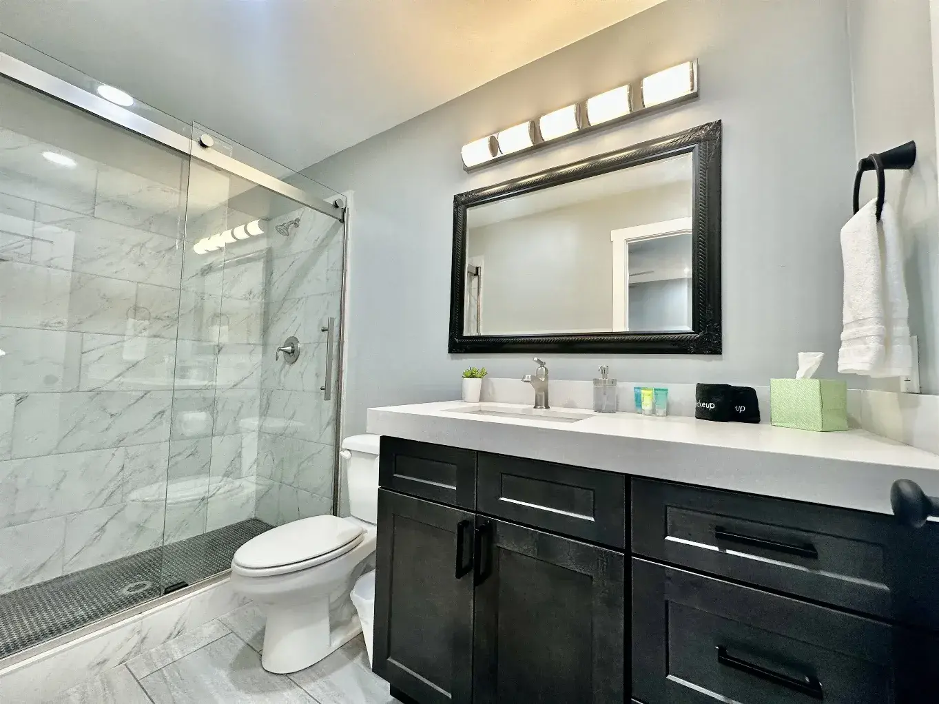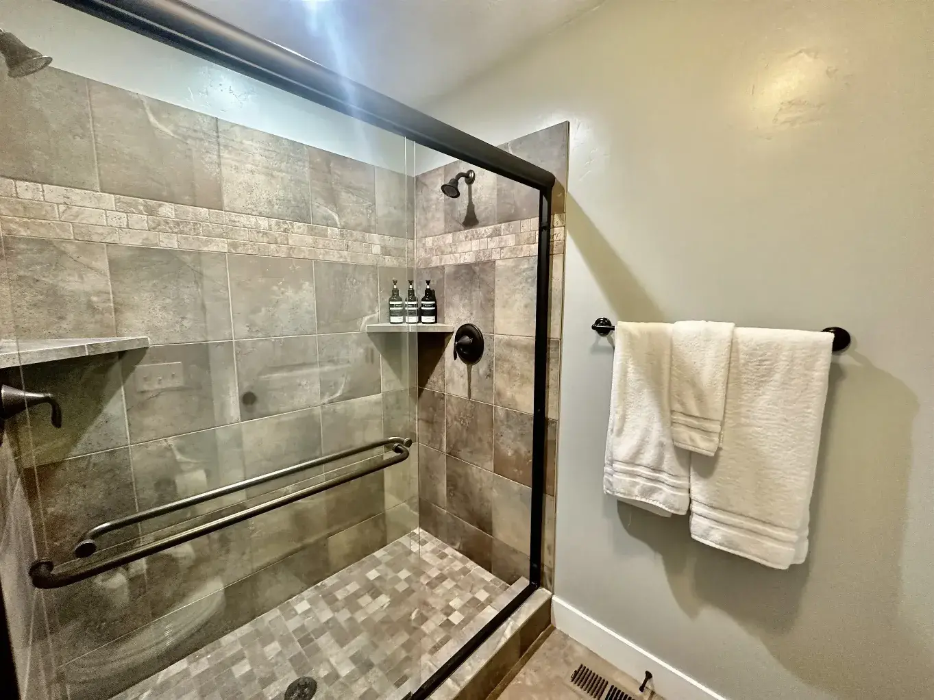 SUITE #1 - King Bed with ensuite bath, this suite offers large flat screen TV and large closet and luxurious spa like shower. Watch your favorite shows on a 43" Flat Screen Smart TV. The suite is very large and can easily accommodate an additional guest bed.