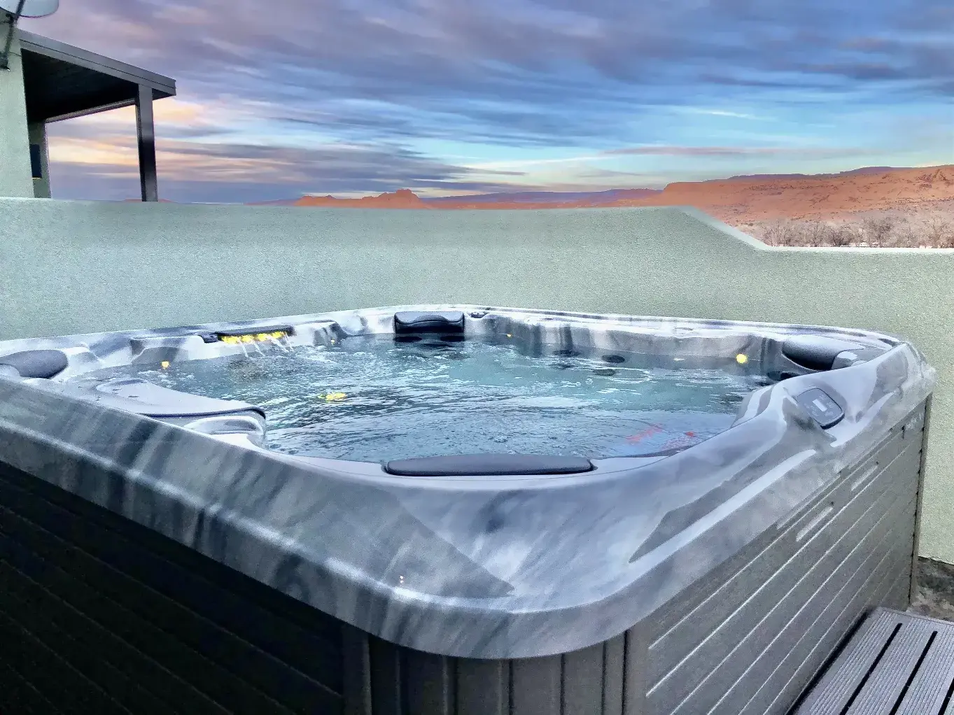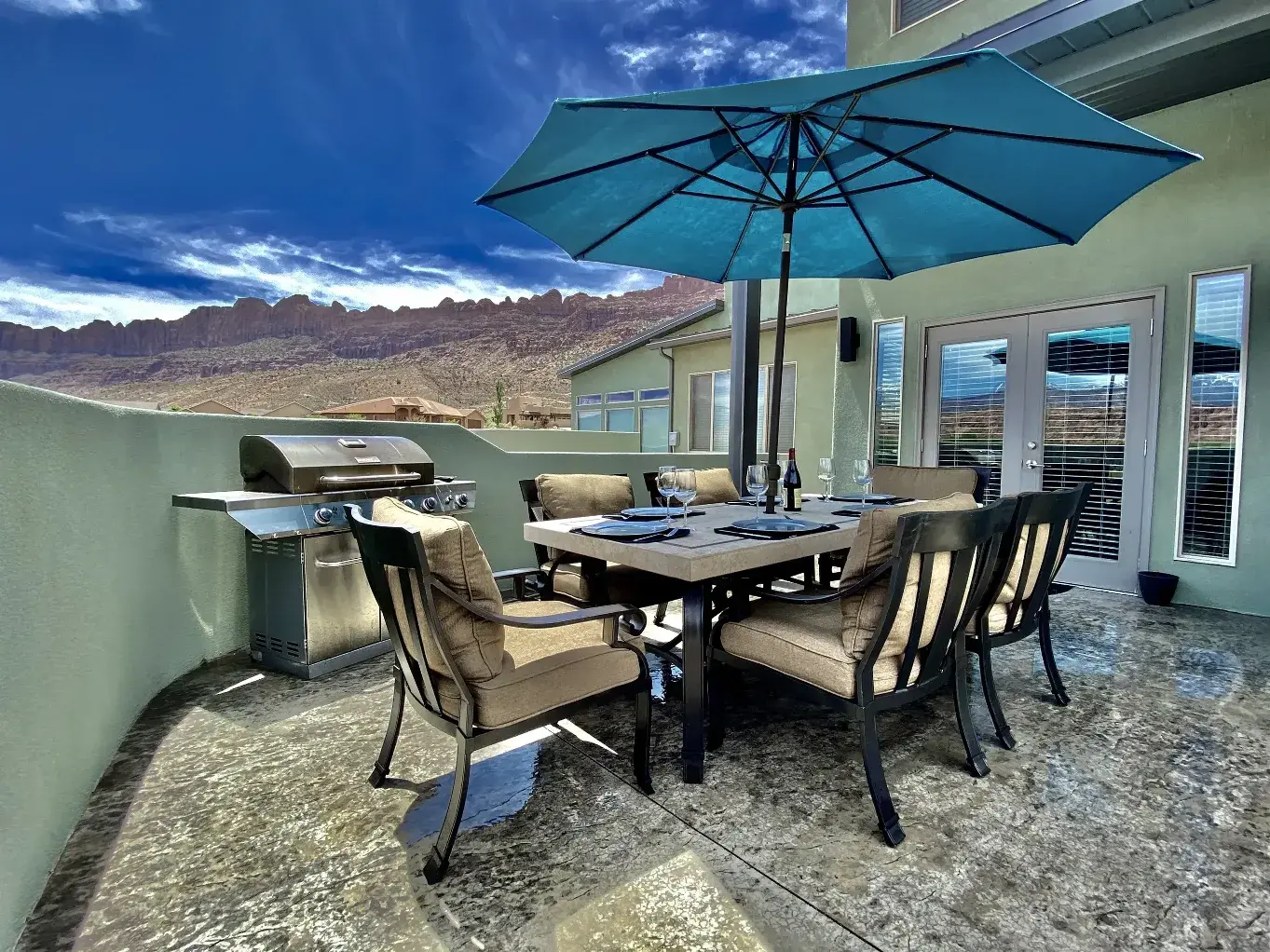 OUTDOOR PATIOS: Wrap around patio maximizes the spectacular red rock and La Sal mountain views. Grill your favorite meal on the BBQ and dine on the patio with a pergola cover and custom sunshade. We have a new 7- person spa for you to relax in after the long day of playing in the desert. Sit in the evening around the fire pit with room for everyone.