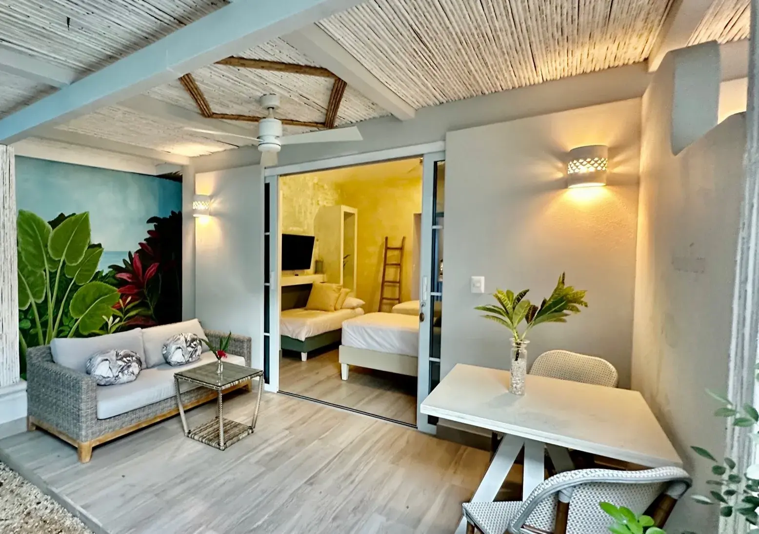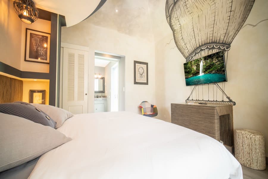GUEST SUITE #6 - King Bed with Twin Day Bed with En suite bath (Bedding Option for this suite to have 2 Twin beds in the place of the king bed), this suite offers large flat screen TV and large closet and luxurious spa rain shower. Private outdoor Patio with seating area. Watch your favorite shows on a 50" Flat Screen Smart TV. The suite is very large and can easily accommodate additional guest beds.