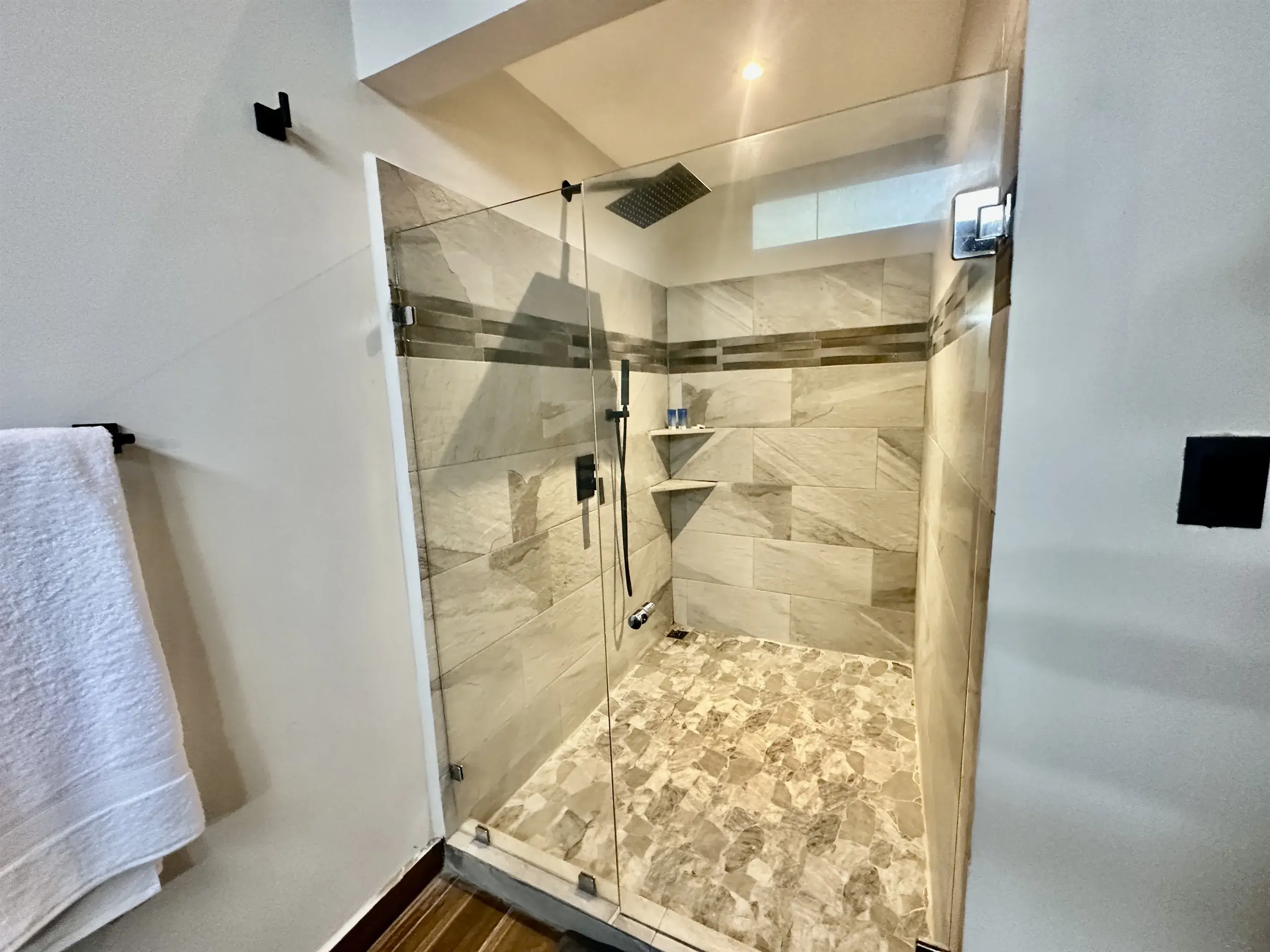 Features a large flat screen TV, spacious closet, and a luxurious spa rain shower.