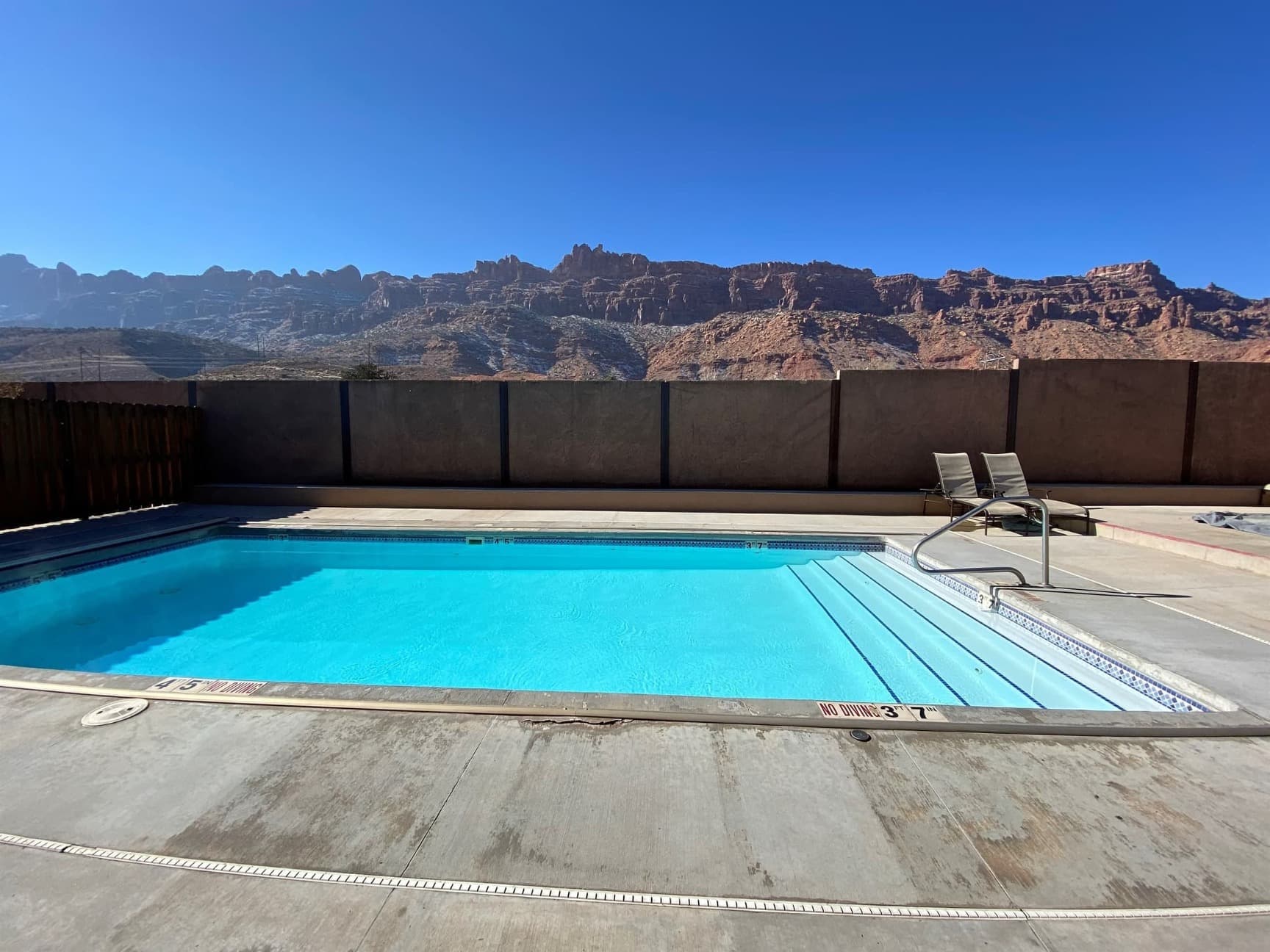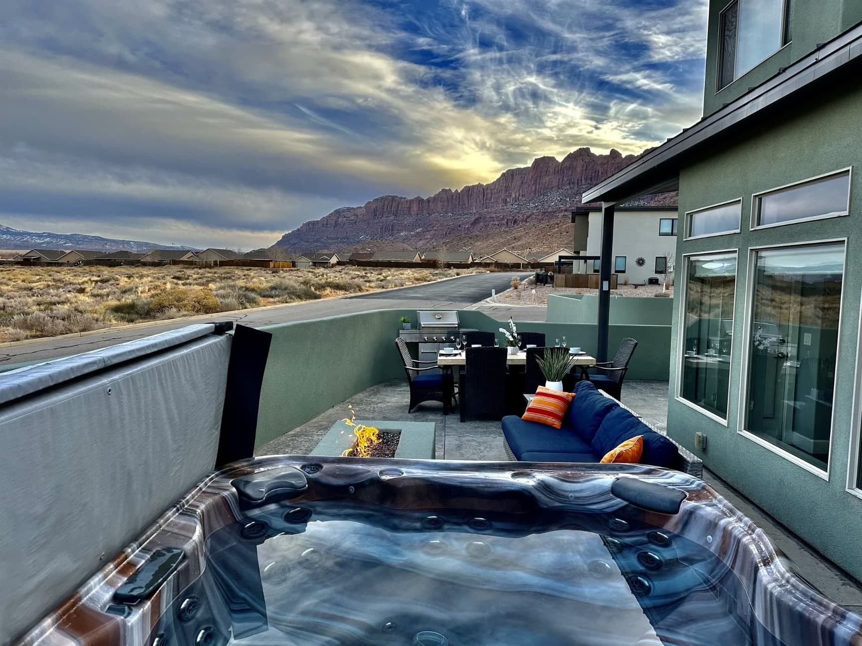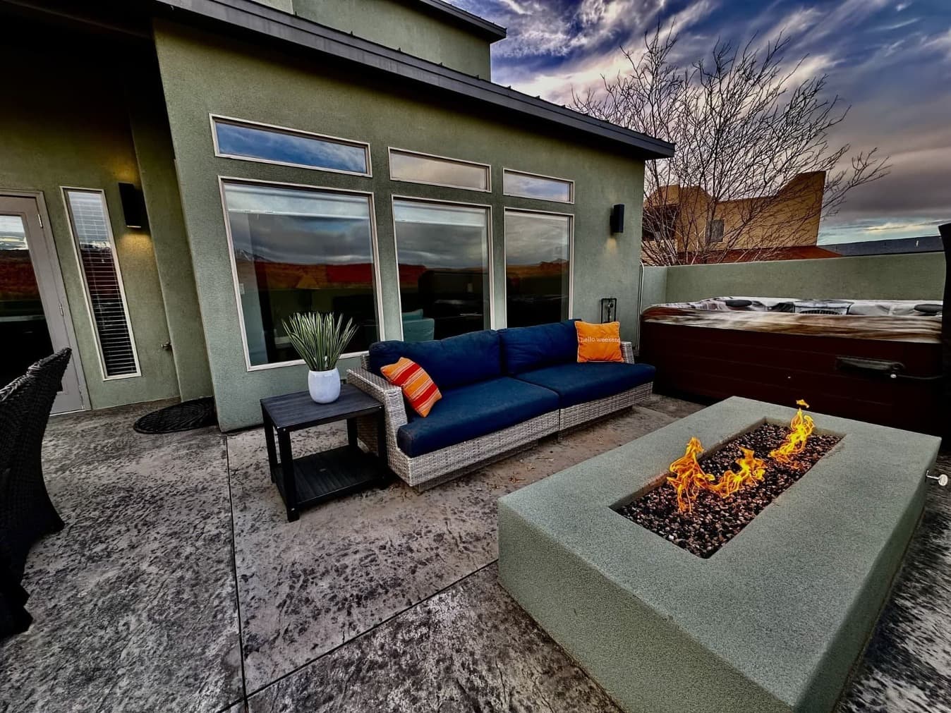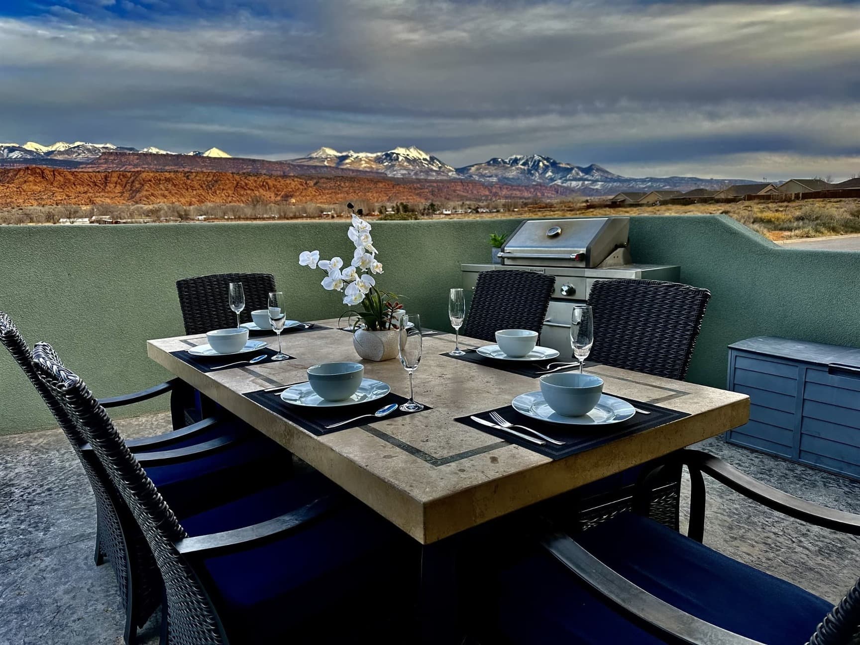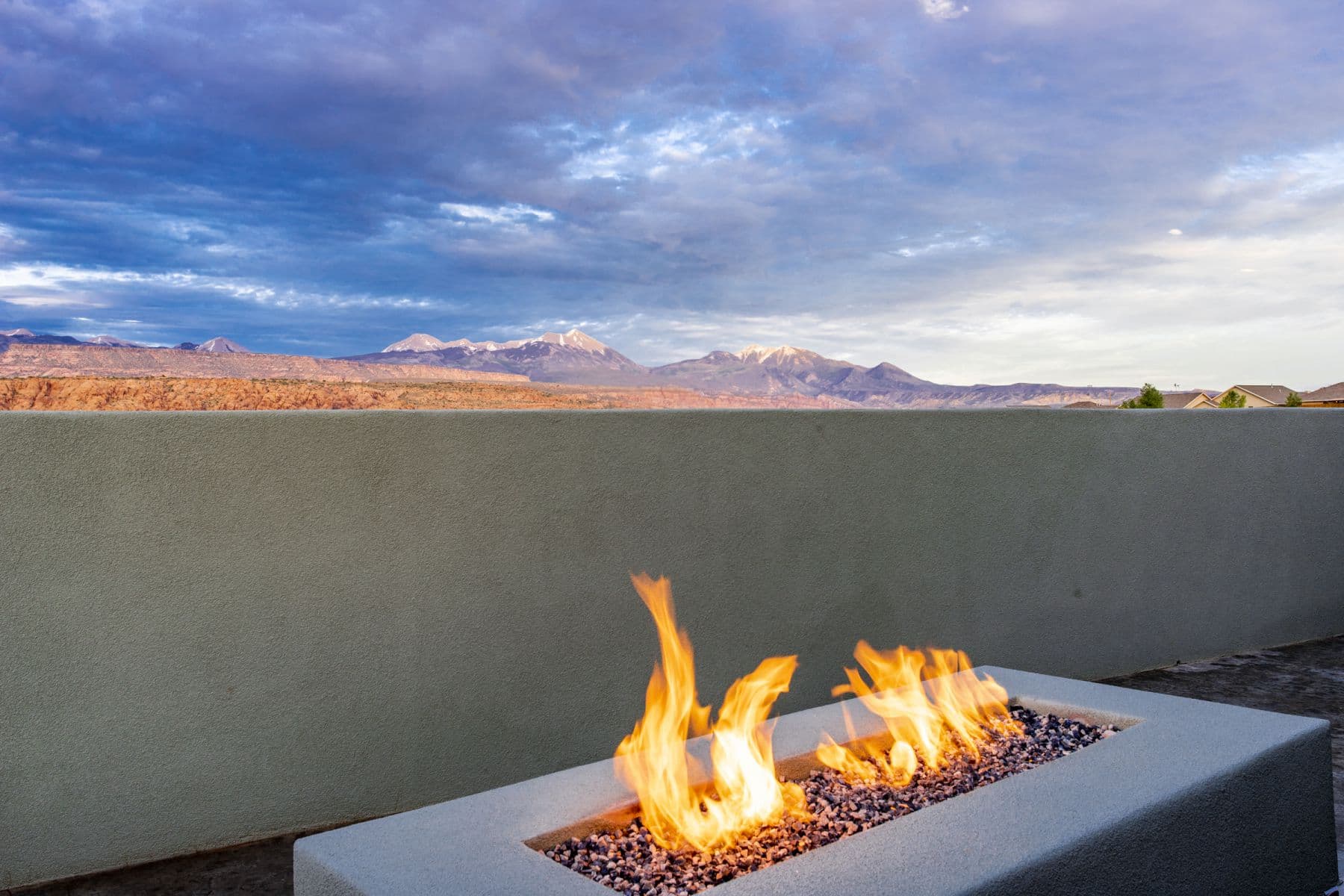 OUTDOOR PATIOS: Wrap around patio maximizes the spectacular red rock and La Sal mountain views. Grill your favorite meal on the BBQ and dine on the patio with a pergola cover and custom sun shade. We have a new 8 person spa purchased in 2019 for you to relax in after the long day of playing in the desert. Sit in the evening around the custom built fire pit with room for everyone.