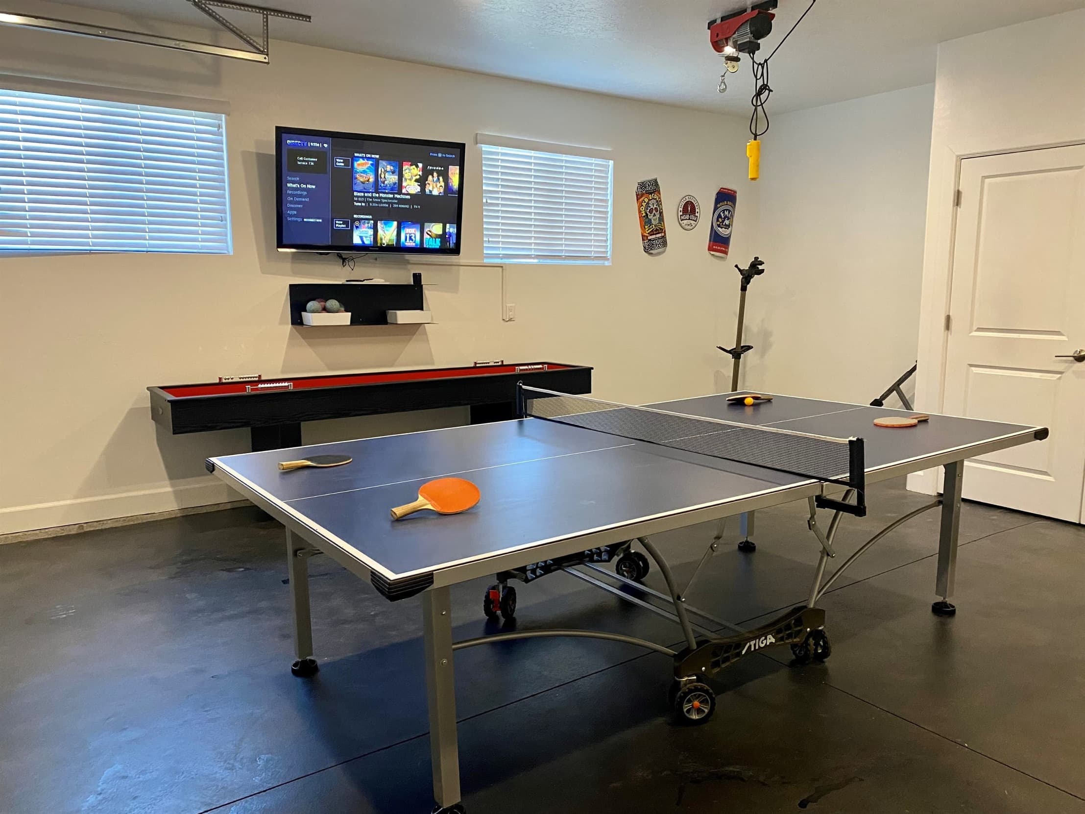 GAME ROOM: Located in the garage with Ping Pong Table(can be folded and stored) 55" Flat Screen TV, Dart Board
