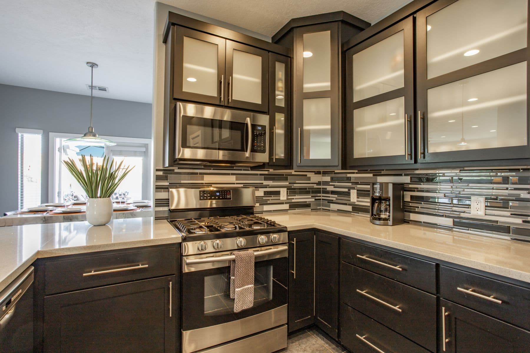 KITCHEN: This spacious kitchen comes fully equipped with appliances including coffee maker, blender, toaster, gas stove, refrigerator with ice maker, microwave and dishwasher. Large dining table seats eight. Double doors lead out to a large back patio equipped with BBQ gas grill, ambient lighting and outdoor seating, gas fire pit and 8 person private hot tub.