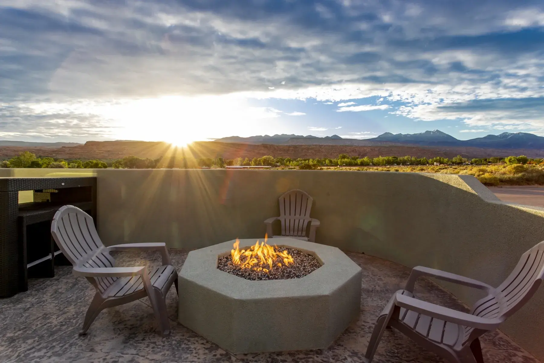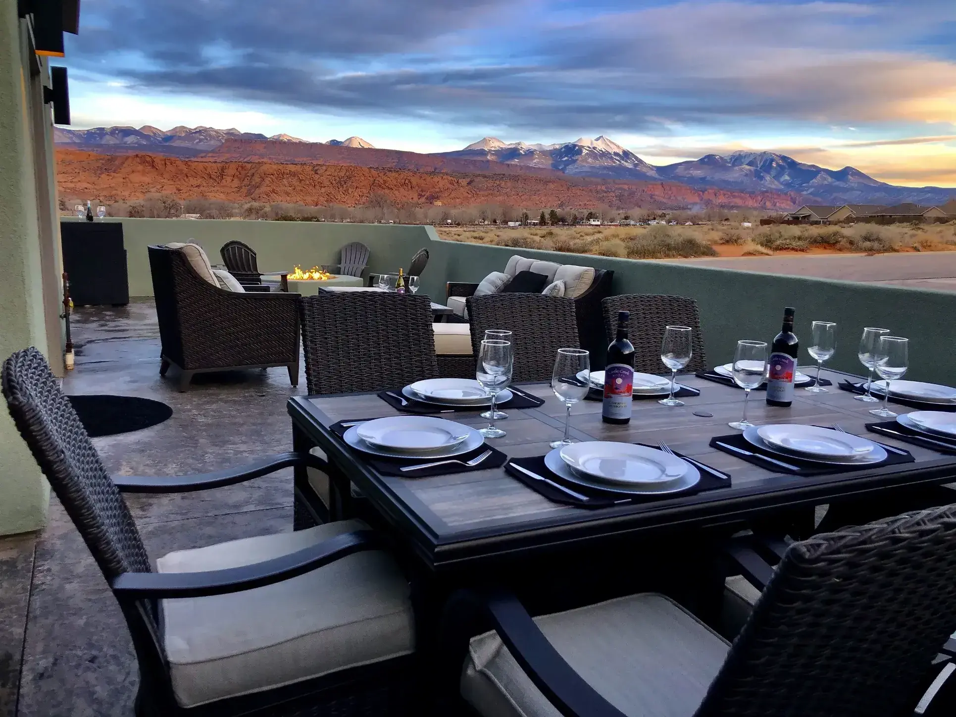OUTDOOR PATIOS: Wrap around patio maximizes the spectacular red rock and La Sal mountain views. Grill your favorite meal on the BBQ and dine on the patio with a pergola cover and custom sun shade. We have a new 8 person spa purchased in 2019 for you to relax in after the long day of playing in the desert. Sit in the evening around the custom built fir pit with room for everyone.