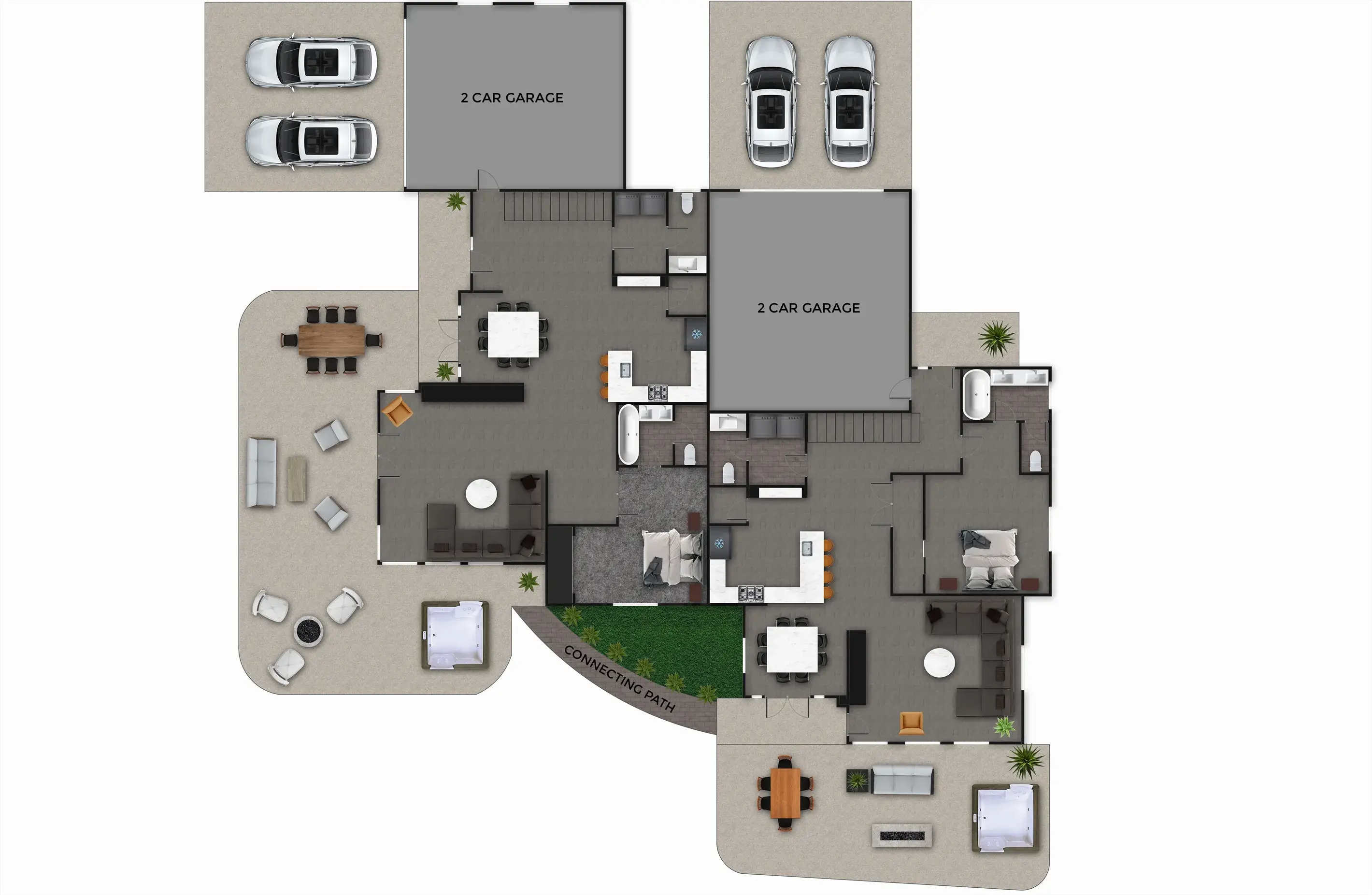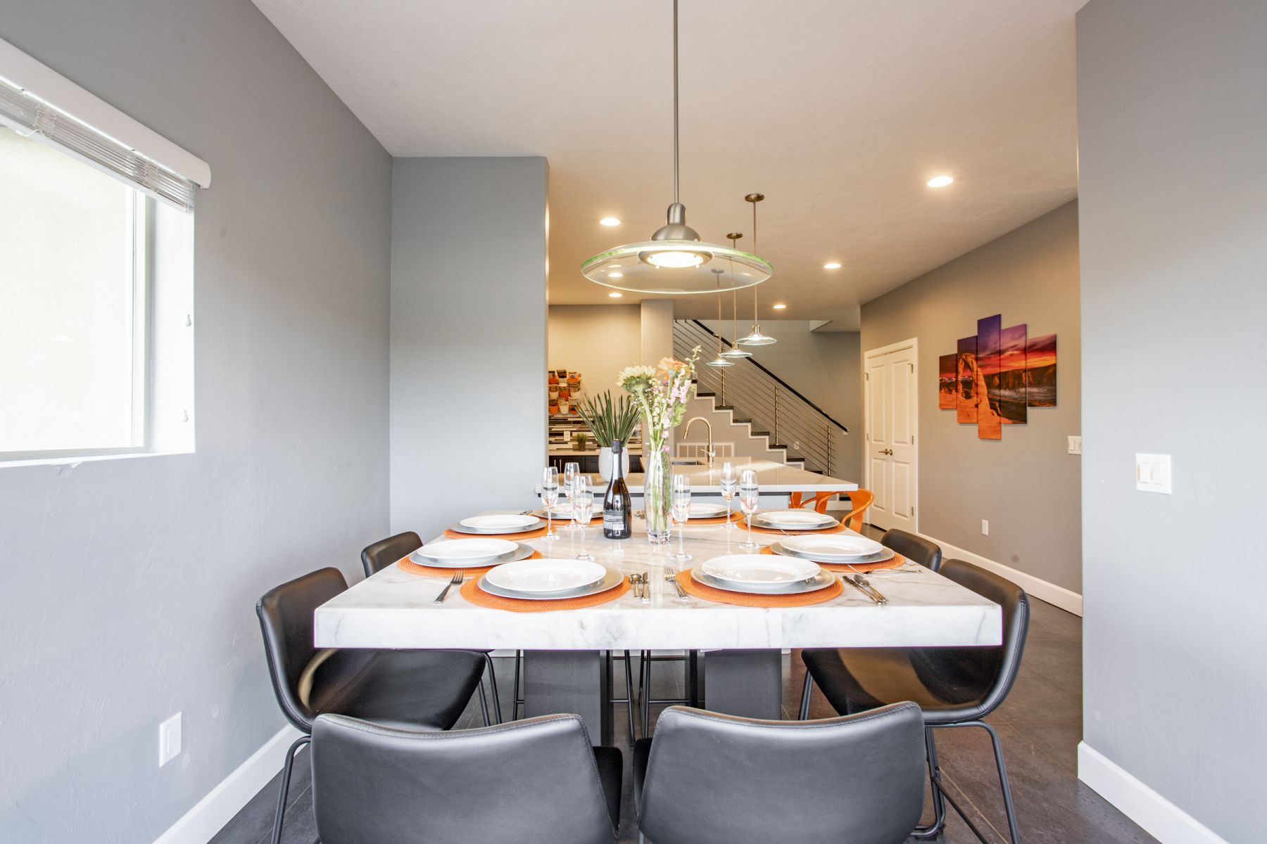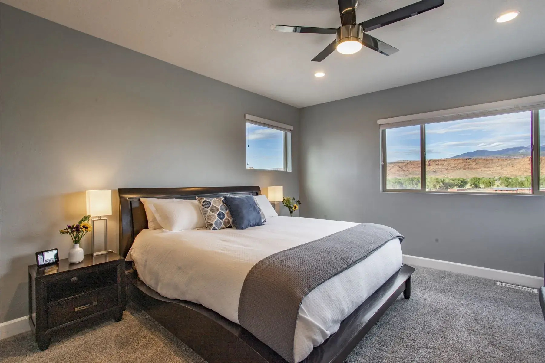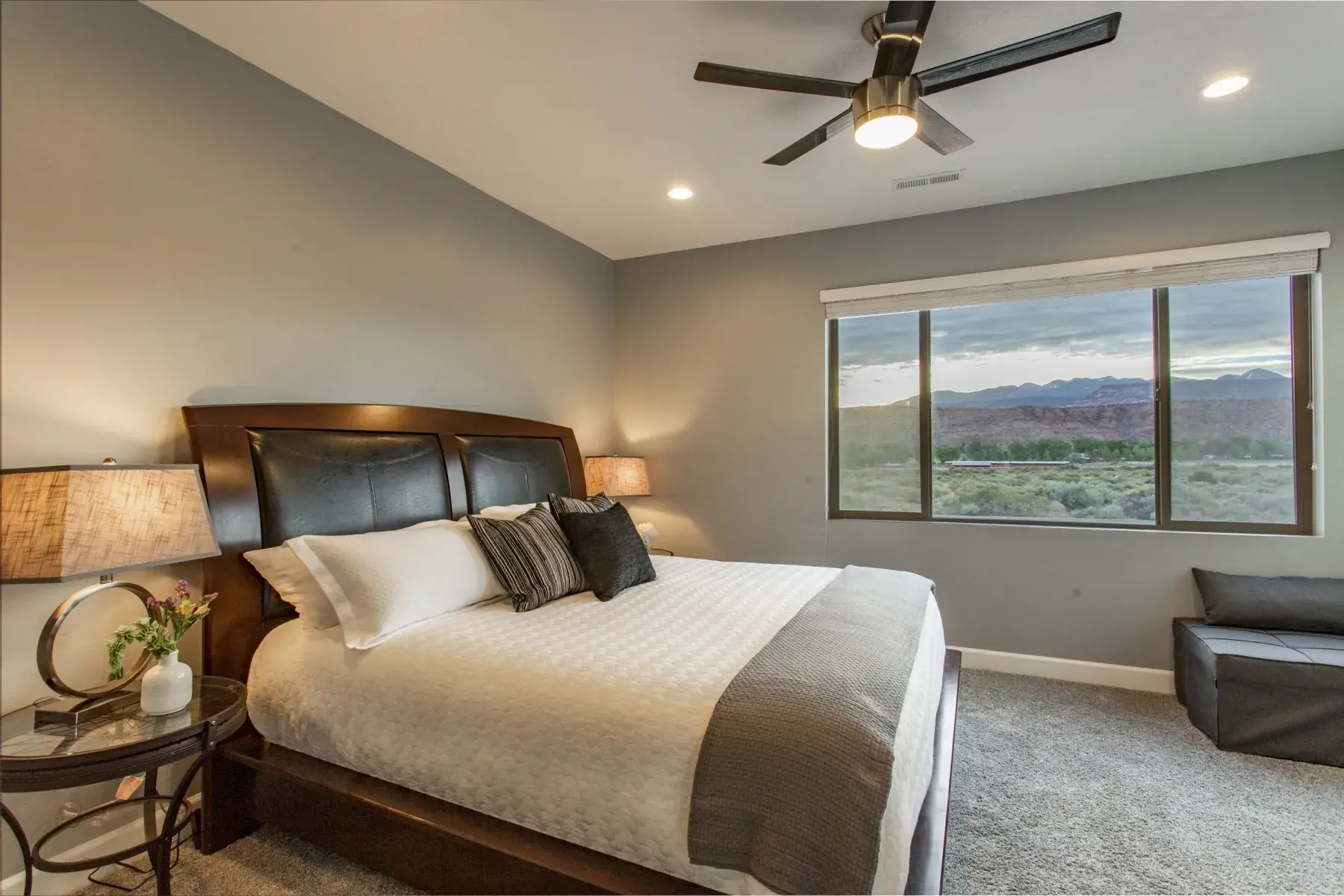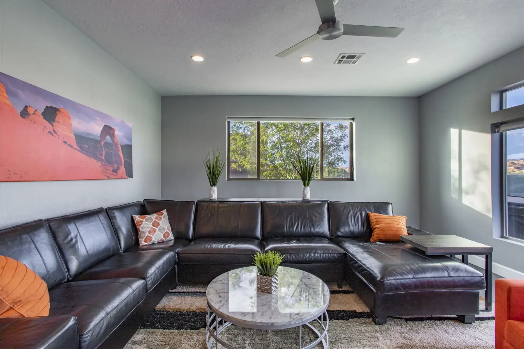 This Large home is made up of 2 attached 3 Bedroom 3.5 Baths Large Luxury homes designed and custom built as a Luxury vacation rental. They are connected for the group to access wrap around decks with 2 hot tubs and built so everyone has great sleeping accommodations. This homes comes with an oversized 4 car garage with automatic Jeep cover lift and plenty of parking for all your toys. Your group will appreciate the 5000 plus square feet of living and 2000 feet of outdoor living space. This property is perfect for very large groups or can be booked just one side at a time with sleeping at 12 persons per side. Our focus with this property is that everyone is comfortable with Luxury accommodations so no one feels they got the short end of the stick. The home is located 5 minutes from down town Moab and 10 minutes to Arches National park is the perfect location for your trip to Moab. This contemporary masterpiece is stock with everything you will need to make your stay with us a perfect 10. You will enjoy all the views Moab has to offer with large patios and custom built in fire pit for those amazing Moab nights with unmatched star gazing. Note: We have additional large homes with private pools at exclusiveretreats direct site.