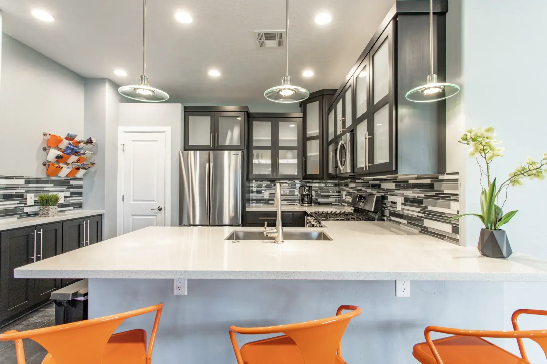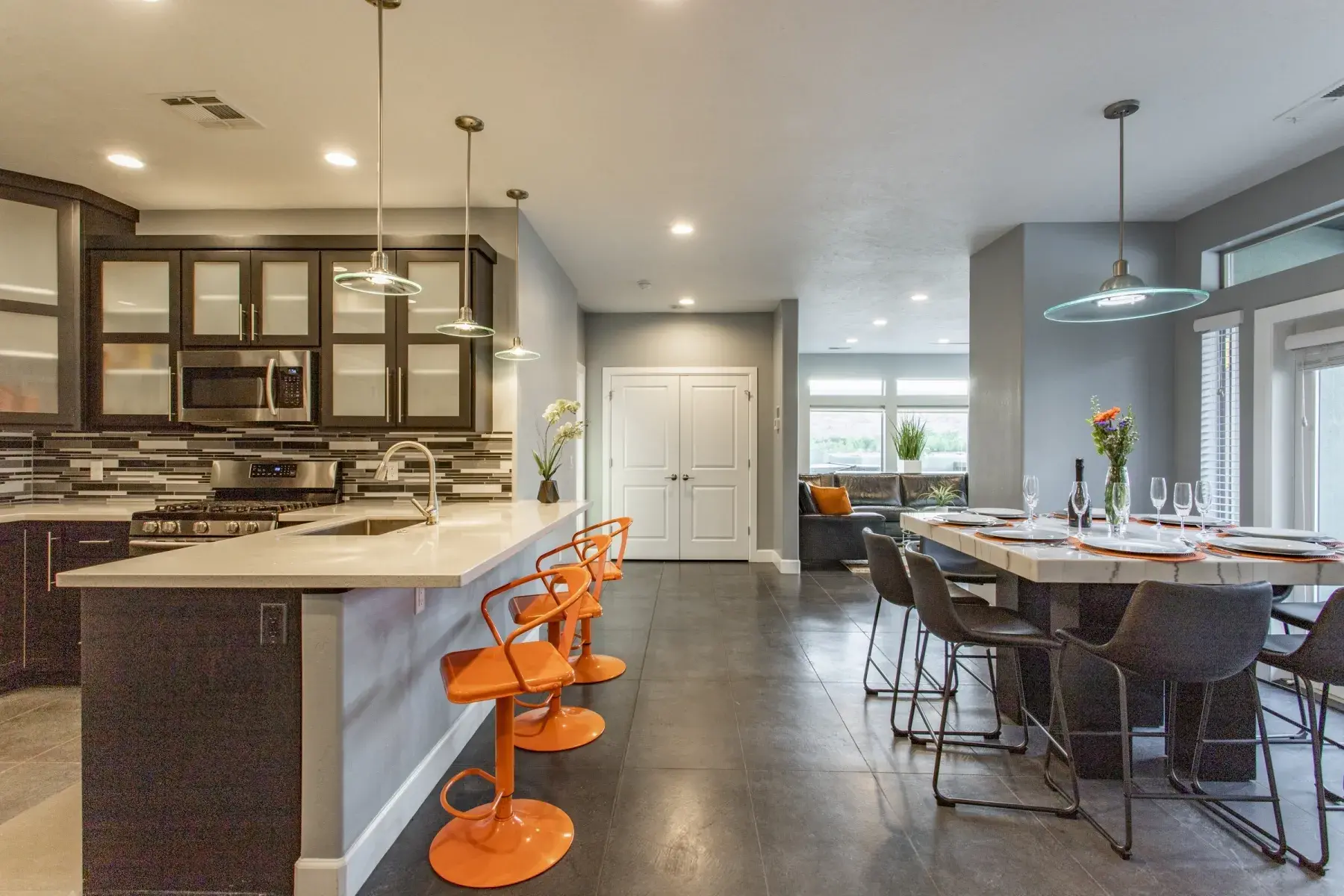 KITCHEN: This spacious kitchen comes fully equipped with appliances including coffee maker, blender, toaster, gas stove, refrigerator with ice maker, microwave and dishwasher. Large dining table seats eight. Double doors lead out to a large back patio equipped with BBQ gas grill, ambient lighting and outdoor seating, gas fire pit and 8 person private hot tub.